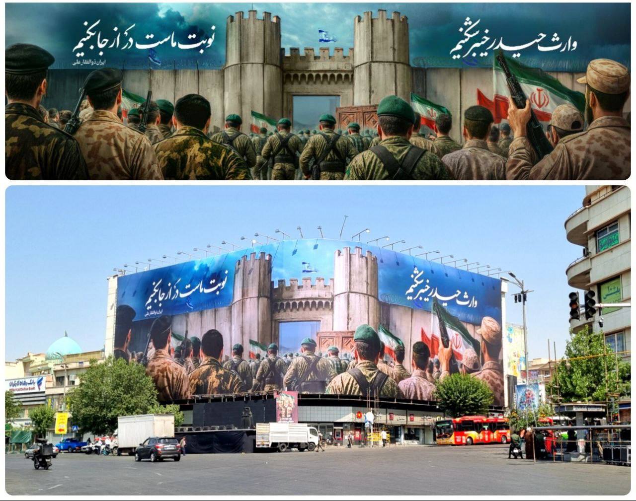 در آستانه برپایی تجمع بزرگ مردمی علیه رژيم  صهیونیستی در روز عید غدیر، دیوارنگاره میدان انقلاب تهران با شعار «ایران، ذوالفقار علی (ع)» رونمایی شد. این دیوارنگاره با محوریت یادآوری فتح خیبر و جمله‌ی «وارث حیدر خیبرشکنیم / نوبت ماست که در از جا بکنیم» به نمایش گذاشته شده است.