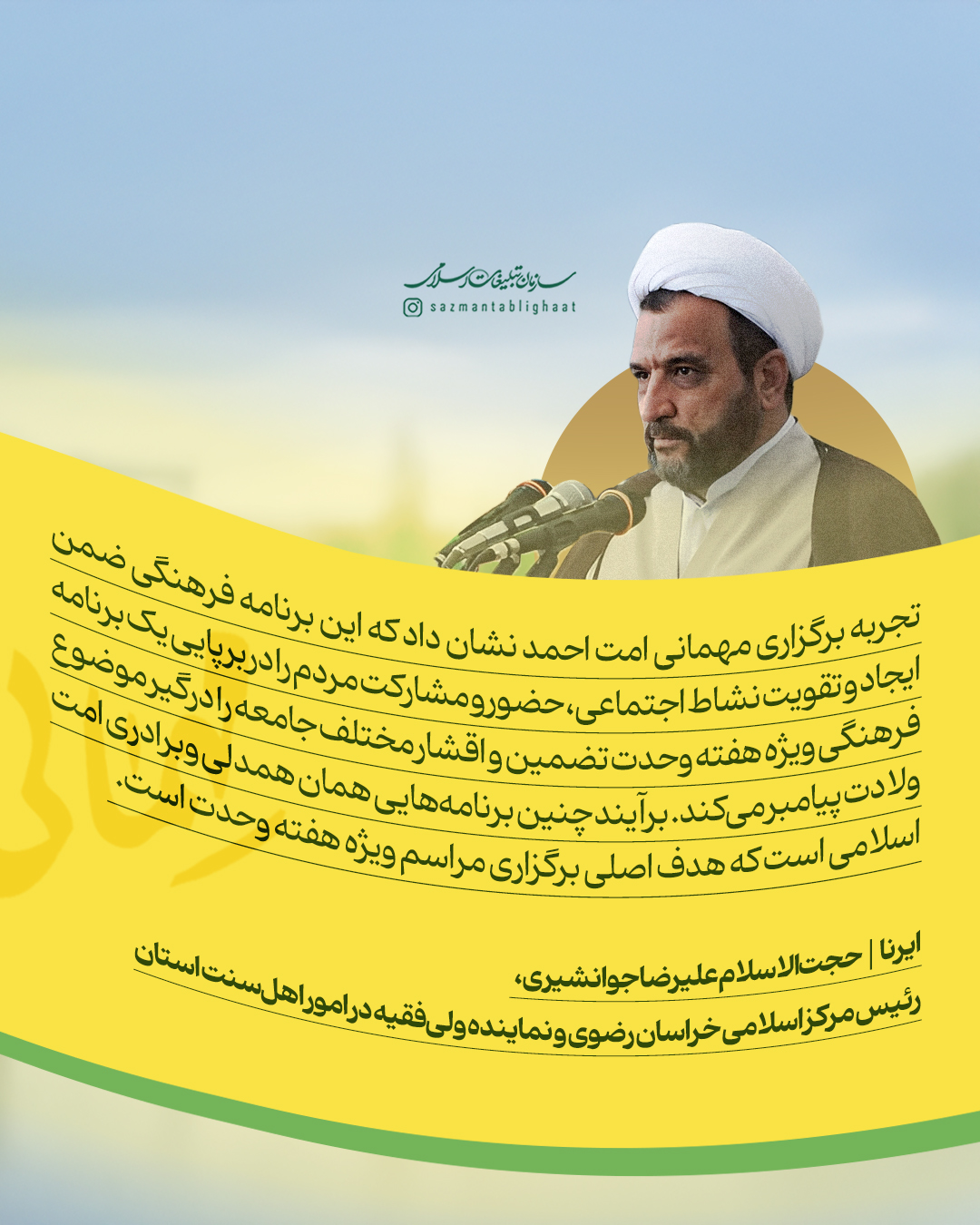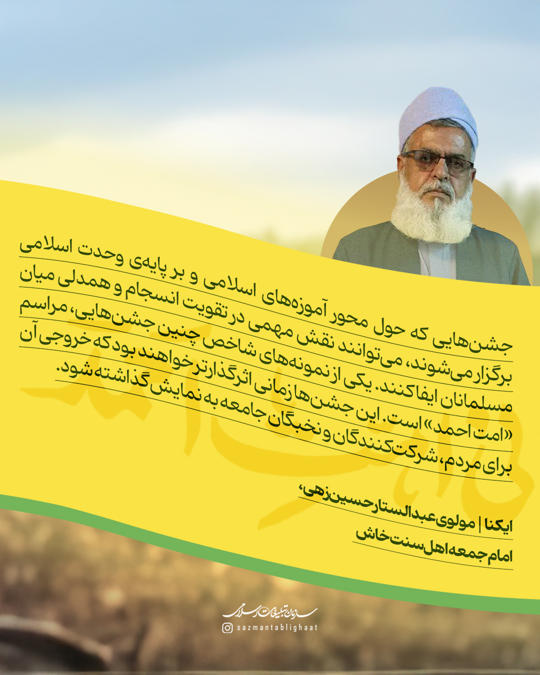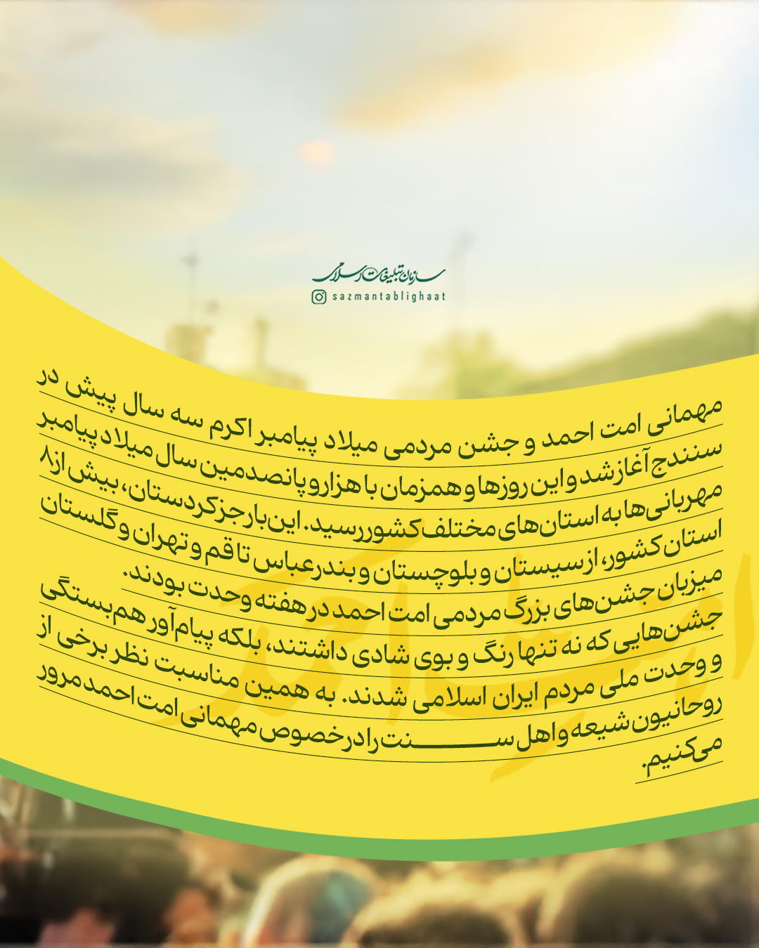 به گزارش روابط عمومی سازمان تبلیغات اسلامی، مهمانی امت احمد و جشن مردمی میلاد پیامبر اکرم سه سال پیش در سنندج آغاز شد و امسال، همزمان با هزار و پانصدمین سال میلاد پیامبر مهربانی‌ها به استان‌های مختلف کشور رسید. این‌بار جز کردستان، بیش از 8 استان کشور، از سیستان و بلوچستان و بندرعباس تا قم و تهران و گلستان میزبان جشن‌های بزرگ مردمی امت احمد در هفته وحدت بودند. جشن‌هایی که نه تنها رنگ و بوی شادی داشتند، بلکه پیام‌آور هم‌بستگی و وحدت ملی مردم ایران اسلامی شدند. به همین مناسبت نظر برخی از روحانیون شیعه و اهل سنت را در خصوص مهمانی امت احمد مرور می‌کنیم.