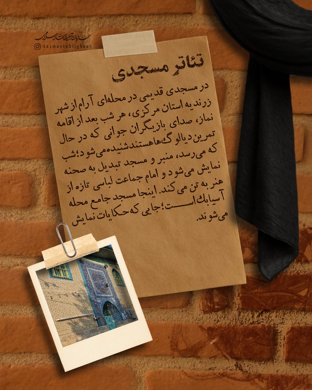 به گزارش روابط عمومی سازمان تبلیغات اسلامی، حجت‌الاسلام «محمود گل‌محمدی» امام محله مسجد جامع آسیابک در شهر زرندیه استان مرکزی است. او که از نوجوانی به ادبیات و نمایشنامه‌نویسی علاقه‌مند بود، با نوشتن نمایشنامه و اجرای نمایش در مسجد تجربه‌ی متفاوتی برای اهالی این محله فراهم کرده است. اتفاقی که منجر به رونق مسجد و حضور فعالانه مردم، خصوصا جوانان و نوجوانان، در مسجد شده است.