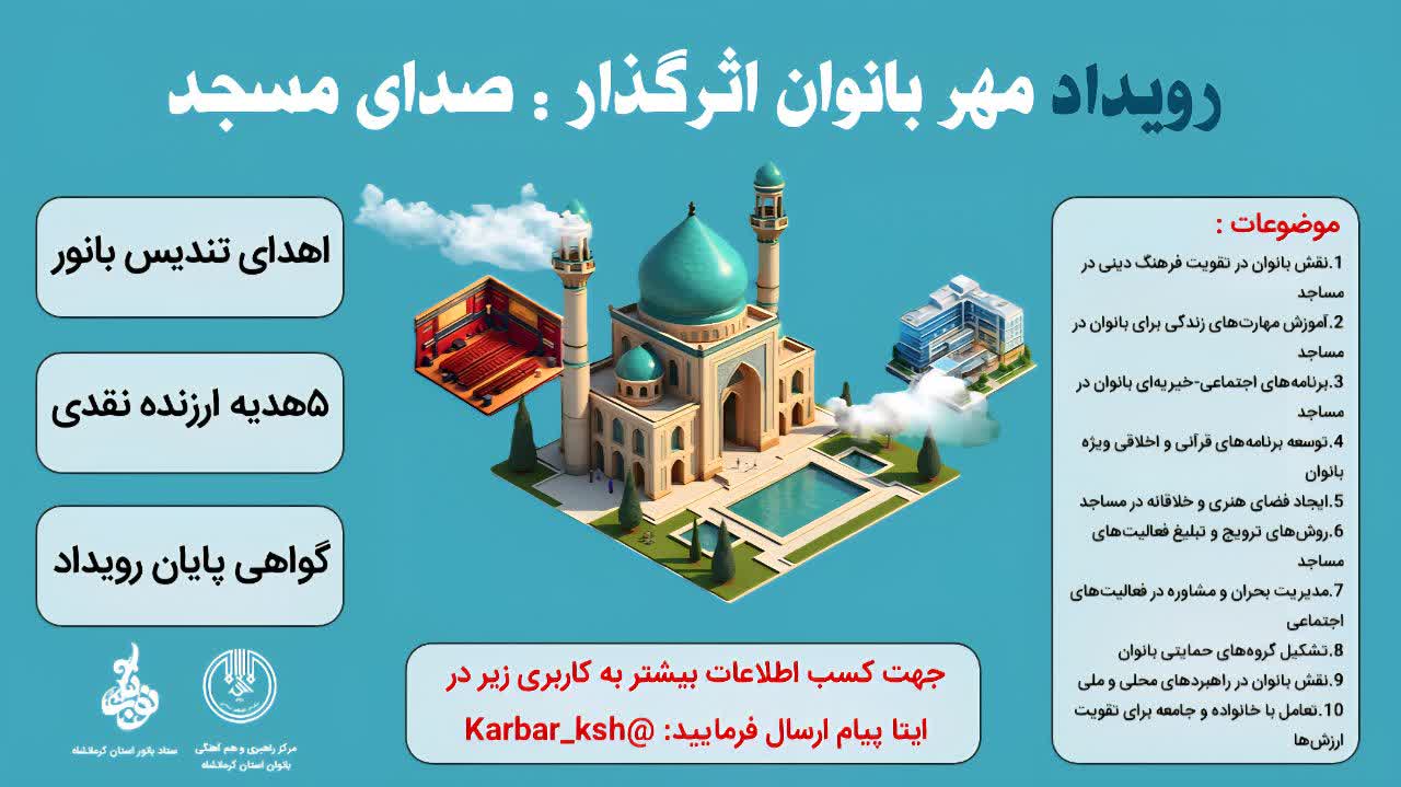 مرکز راهبری و هم آهنگی بانوان اداره کل تبلیغات اسلامی استان کرمانشاه با هدف شناسایی، تقویت و تجلیل از بانوان فعال و تأثیرگذار در فضای مسجدی، رویداد تخصصی "مهر بانوان اثرگذار: صدای مسجد" را برگزار میکند. این رویداد با حضور بانوان فعال مساجد، نخبگان فرهنگی و دینی، به بررسی نقش زنان در تقویت فرهنگ دینی، برنامههای خیریه، قرآنی و اجتماعی در مساجد میپردازد و شامل اهدای تندیس بانور و گواهی پایان رویداد خواهد بود.